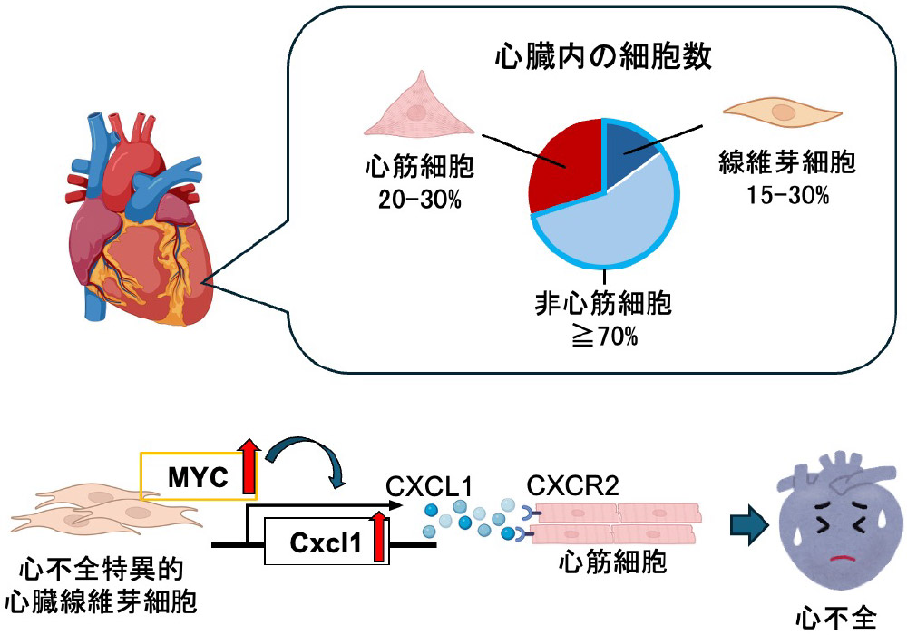 研究チームは、心不全モデルマウスを用いた解析により、これまで「構造を支持しているだけの細胞」と考えられていた線維芽細胞が、MYCというタンパク質を介してCXCL1という分子を分泌し、心筋細胞のCXCR2という受容体を介して心不全を増悪させることを発見しました。さらに、このMYC-CXCL1-CXCR2経路の働きをブロックすることで心不全の悪化を防げることも示され、心不全の新たな原因解明とともに、非心筋細胞を標的とする新しい治療法の可能性が示唆されました。本研究成果は基礎研究段階ですが、ヒト心不全患者でも同様のメカニズムが確認されており、今後の臨床応用が期待されます。本成果は、2025年9月10日、国際学術誌「Nature Cardiovascular Research」に掲載されました。